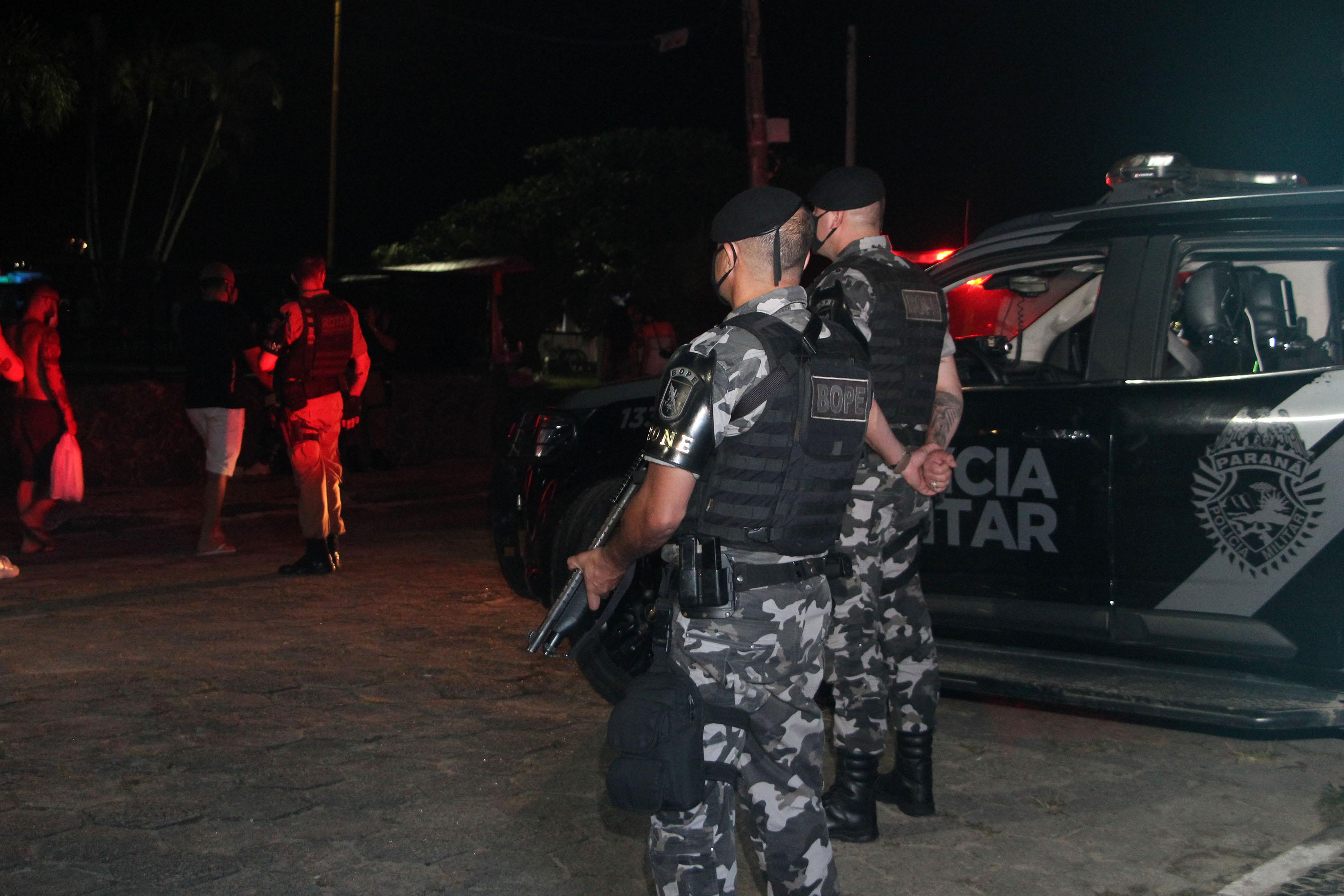 Com o objetivo de proporcionar mais segurança às pessoas que frequentam as praias paranaenses e um fim de ano tranquilo, a Polícia Militar aplicou um efetivo de mais de 400 policiais, nas 3 subáreas (Pontal do Paraná, Matinhos e Guaratuba). As unidades especializadas da corporação: Cavalaria, BOPE (Batalhão de Operações Especiais), BPRv (Batalhão de Polícia Rodoviária), BPTran (Batalhão de Polícia de Trânsito), BPAmb (Batalhão de Polícia Ambiental), BPMOA (Batalhão de Polícia Militar de Operações Aéreas, além da ROCAM (Rondas Ostensivas com Apoio de Motocicletas) e Patrulha Costeira (pertencentes ao 9º Batalhão), prestaram apoio ao policiamento neste feriado de Ano Novo. O Capitão Jimmy Cajuhy Carlesso, Comandante da Subárea II (Matinhos), ressaltou a aplicação do efetivo, “a gente está utilizando nesse momento toda a nossa força, todo o nosso efetivo disponível e o nosso esforço é total no sentido de garantir a segurança das pessoas, de garantir que quem veio à praia, ao litoral, pudesse passar um Ano Novo tranquilo e seguro.”