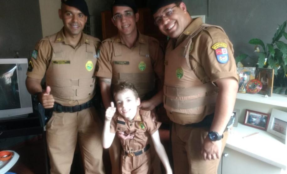 Na sexta-feira (07/12) Luan Pistoni recebeu a visita dos policiais militares da 5ª Companhia do 22º Batalhão. De acordo com a unidade, o garoto tem paralisia hidrocefálica, mas isso não o impede de admirar o trabalho da Corporação. A emoção tomou conta de toda a família quando a equipe entregou o presente de Luan: uma farda da PM do tamanho dele. Todos ficaram agradecidos pelo carinho dos militares estaduais.