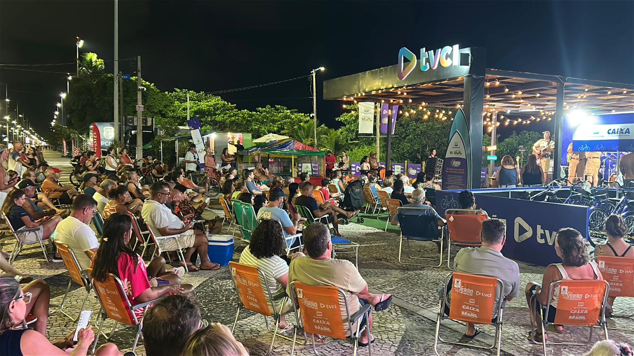 O cenário para o espetáculo foi a ampla estrutura montada pela TVCI, emissora de grande alcance que se estabeleceu como um dos pontos de referência para quem busca conveniência e entretenimento à beira-mar. O espaço Verão Interativo não apenas sediou o show, mas também ofereceu uma gama de serviços gratuitos e à comunidade, incluindo um espaço kids para a diversão segura das crianças, além do empréstimo de cadeiras de praia e bicicletas. Essa infraestrutura permitiu que as famílias desfrutassem da música com total conforto, proporcionando uma experiência especial aos frequentadores do litoral.