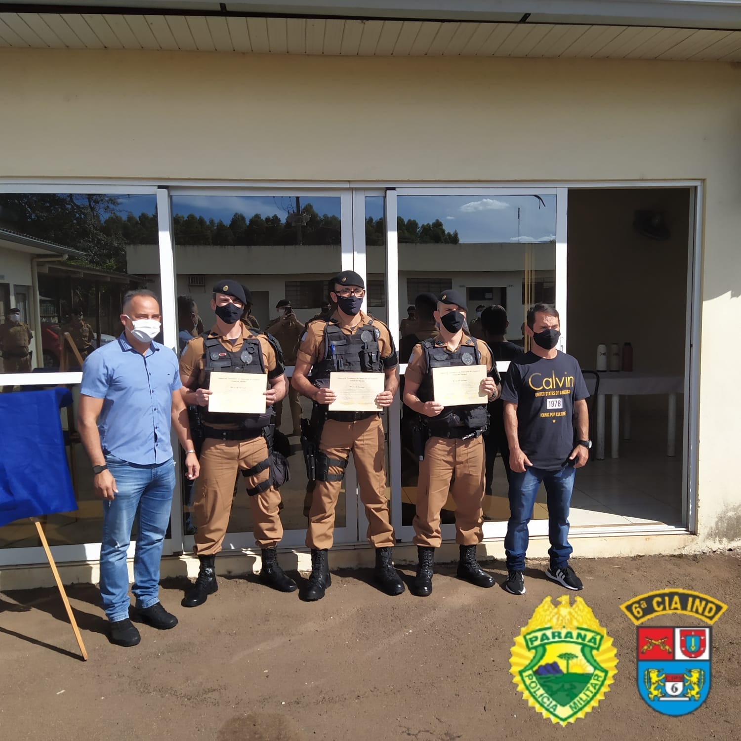 Foi entregue a Moção de Aplausos aos integrantes da companhia, soldado Gomes, soldado Mateus e soldado Rech, por conta de uma ocorrência, que aconteceu no dia 18 de janeiro, em que tiveram êxito em preservar a vida de um rapaz com transtornos psicológicos ao retirá-lo do interior de uma residência com princípio de incêndio.