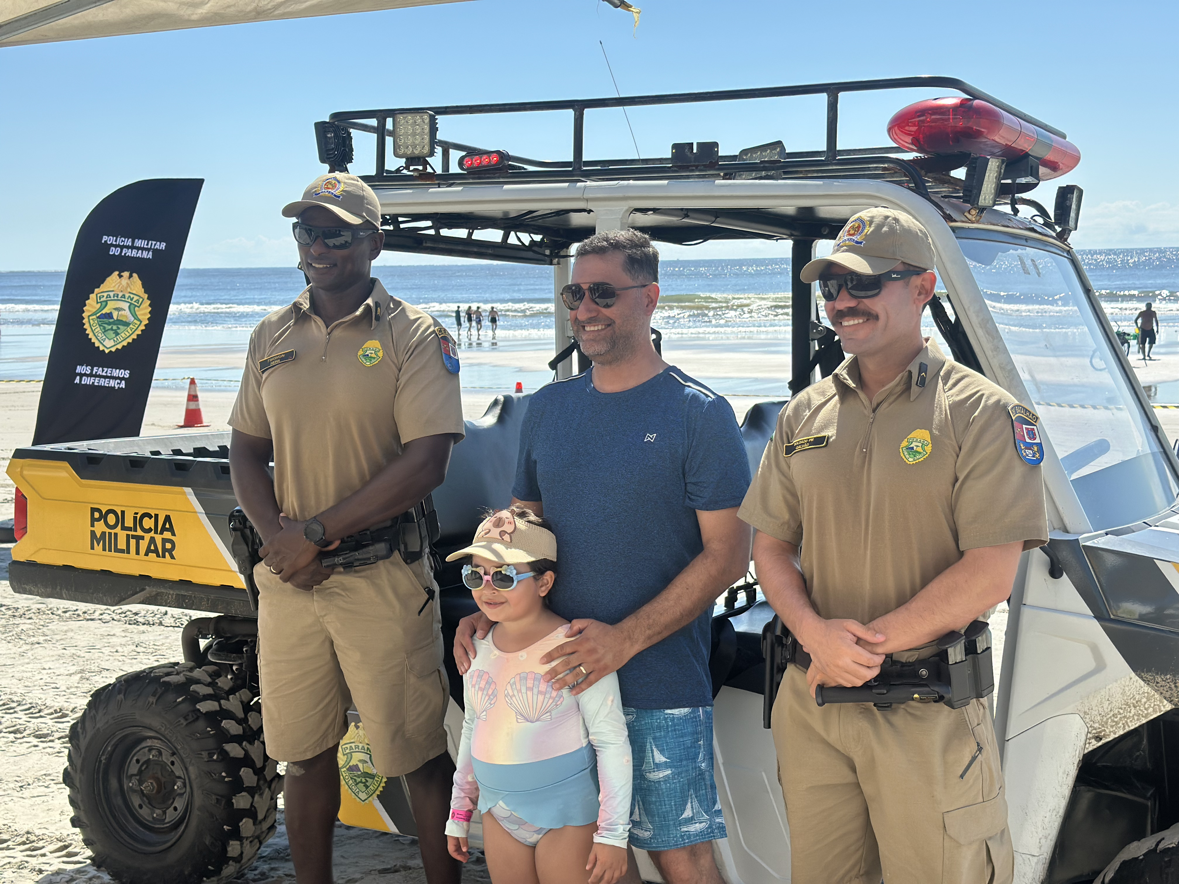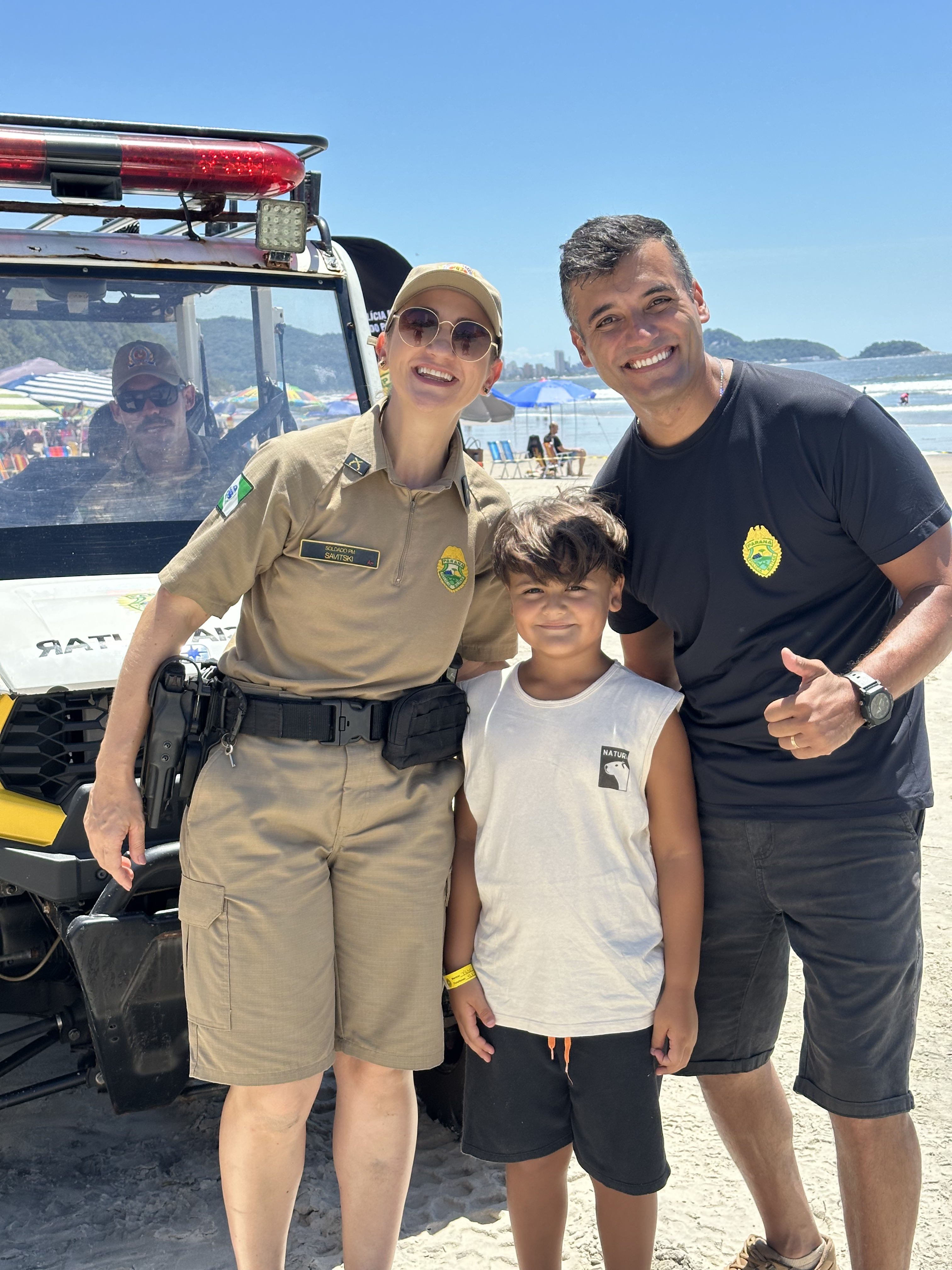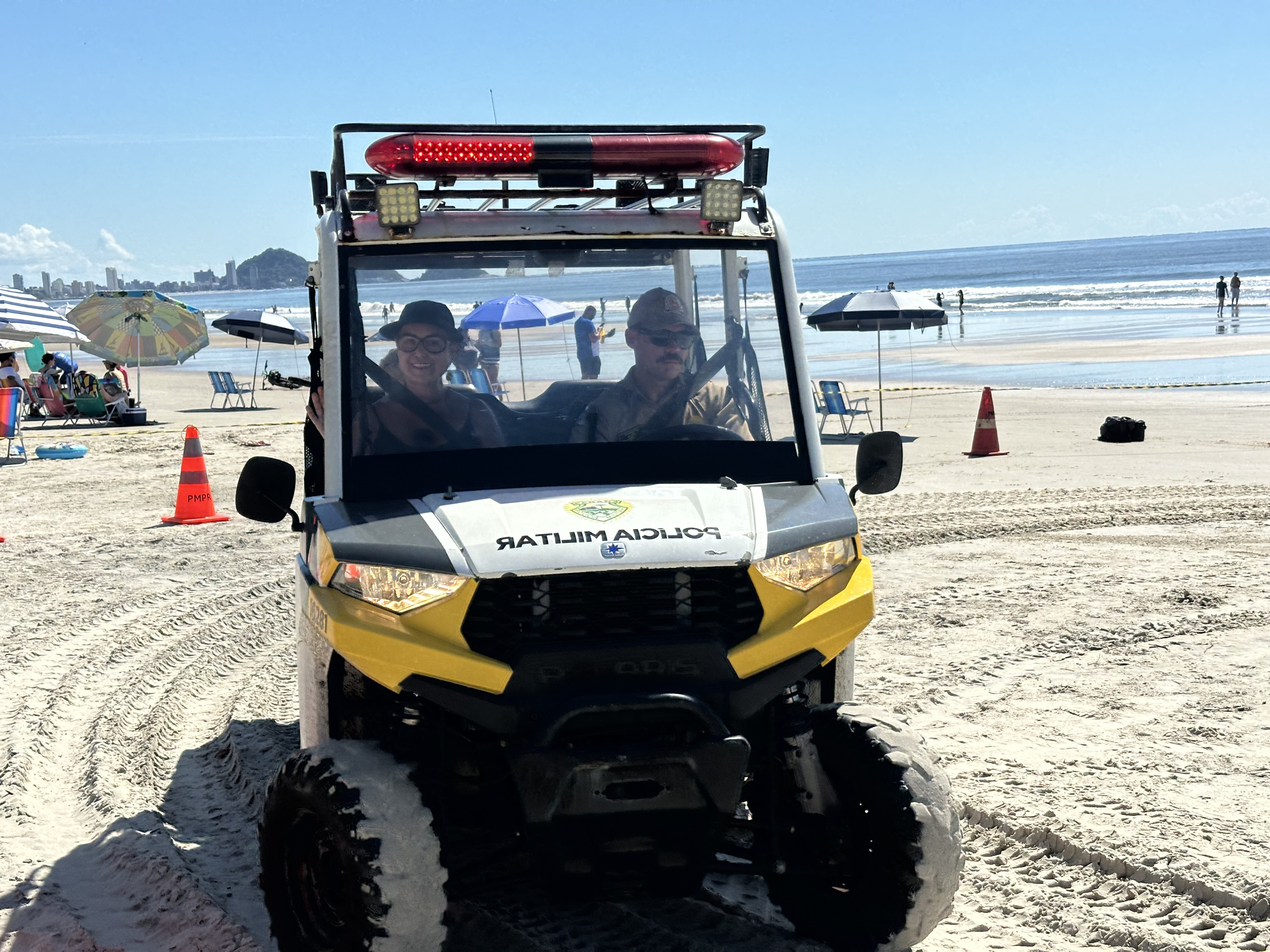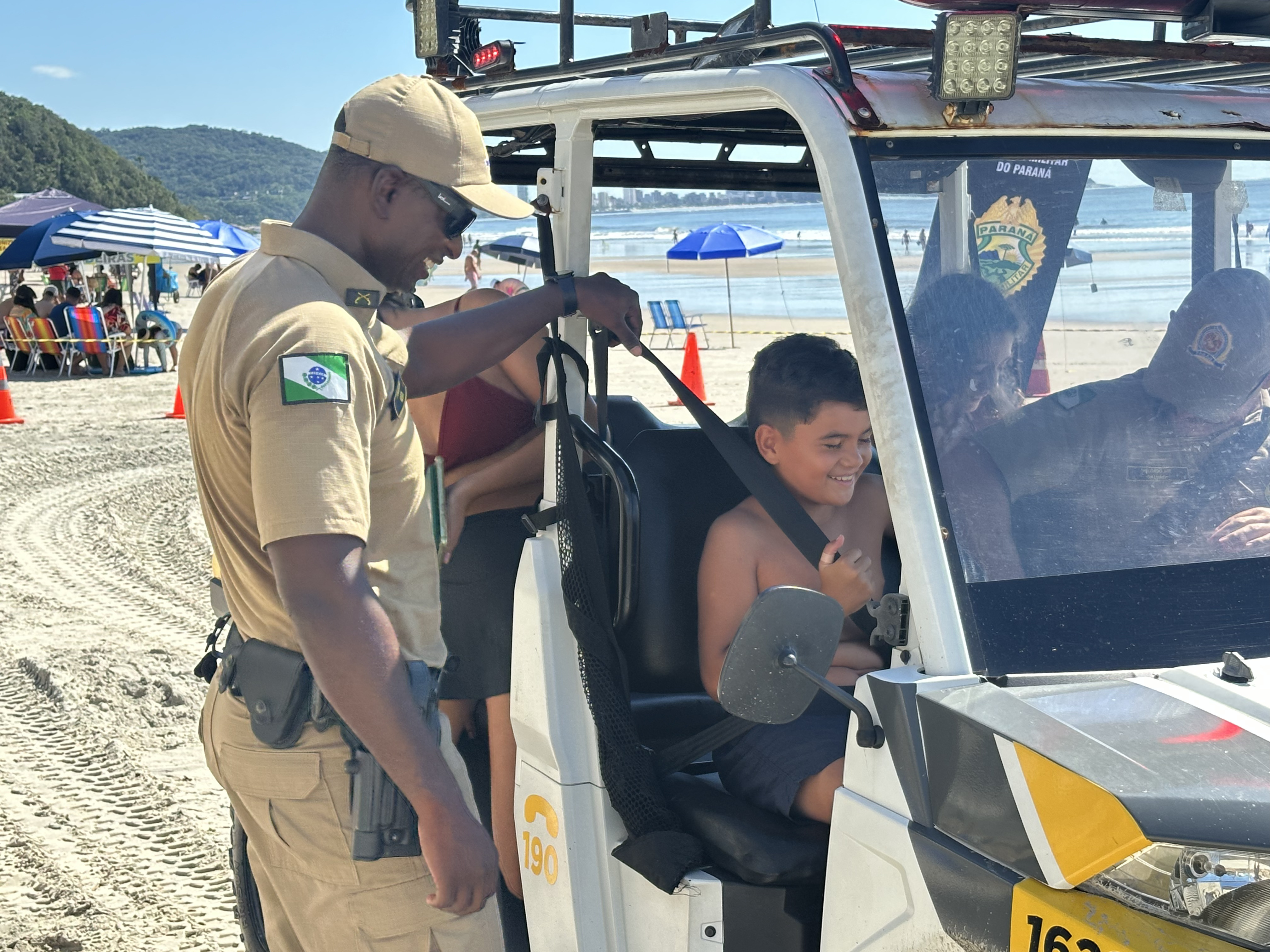 Sorrisos, curiosidade e muita interação marcaram a manhã desta sexta-feira (6) na Praia Central de Guaratuba, durante a ação “Voltinha UTV PMPR”, promovida pela equipe de Interação Comunitária do Centro de Comunicação Social da Polícia Militar do Paraná (PMPR), em conjunto com a equipe de policiamento ostensivo da Operação Verão Maior que atua no município. A iniciativa levou orientação, segurança e diversão a veranistas e moradores, fortalecendo os laços entre a Corporação e a comunidade.