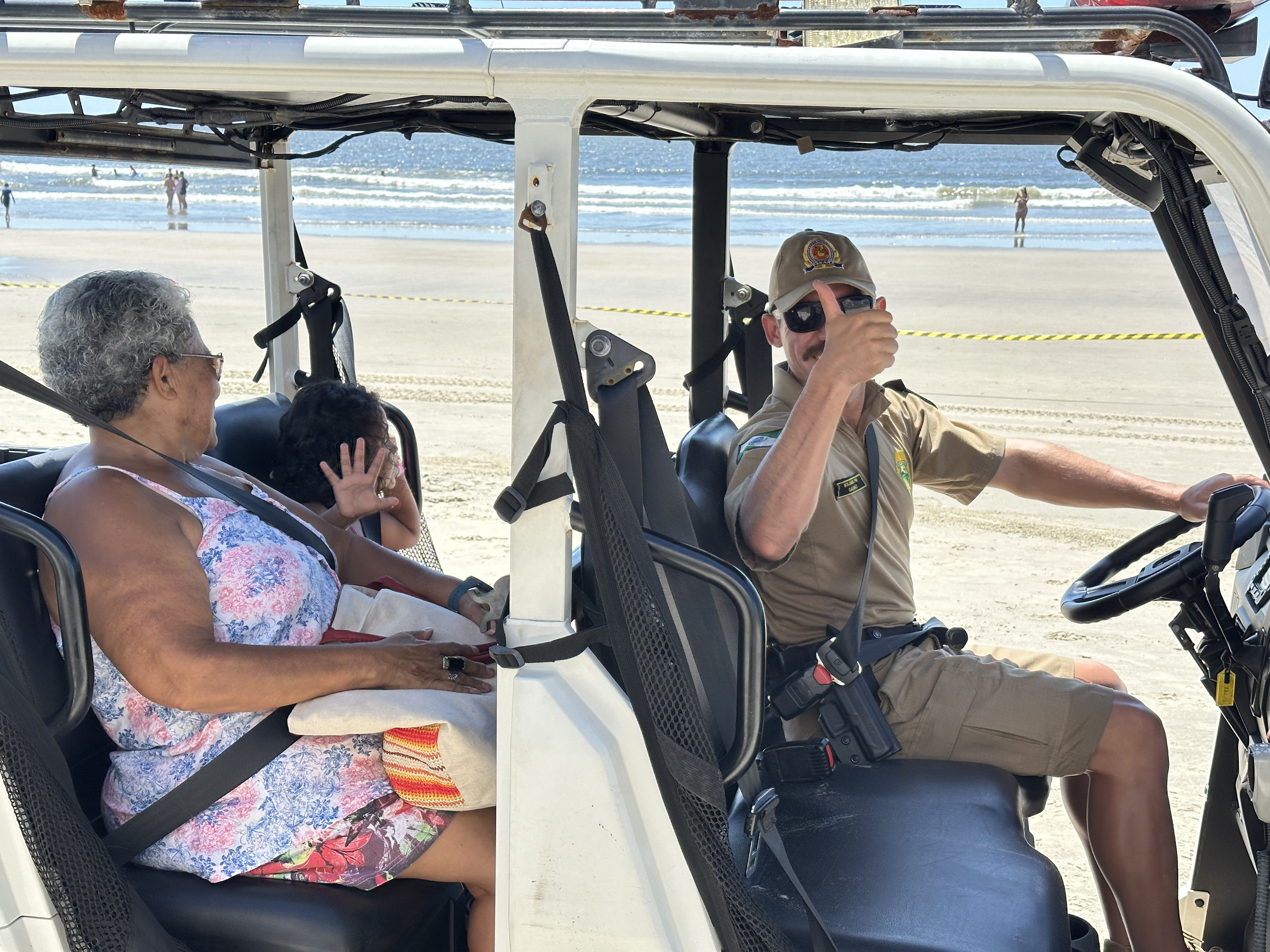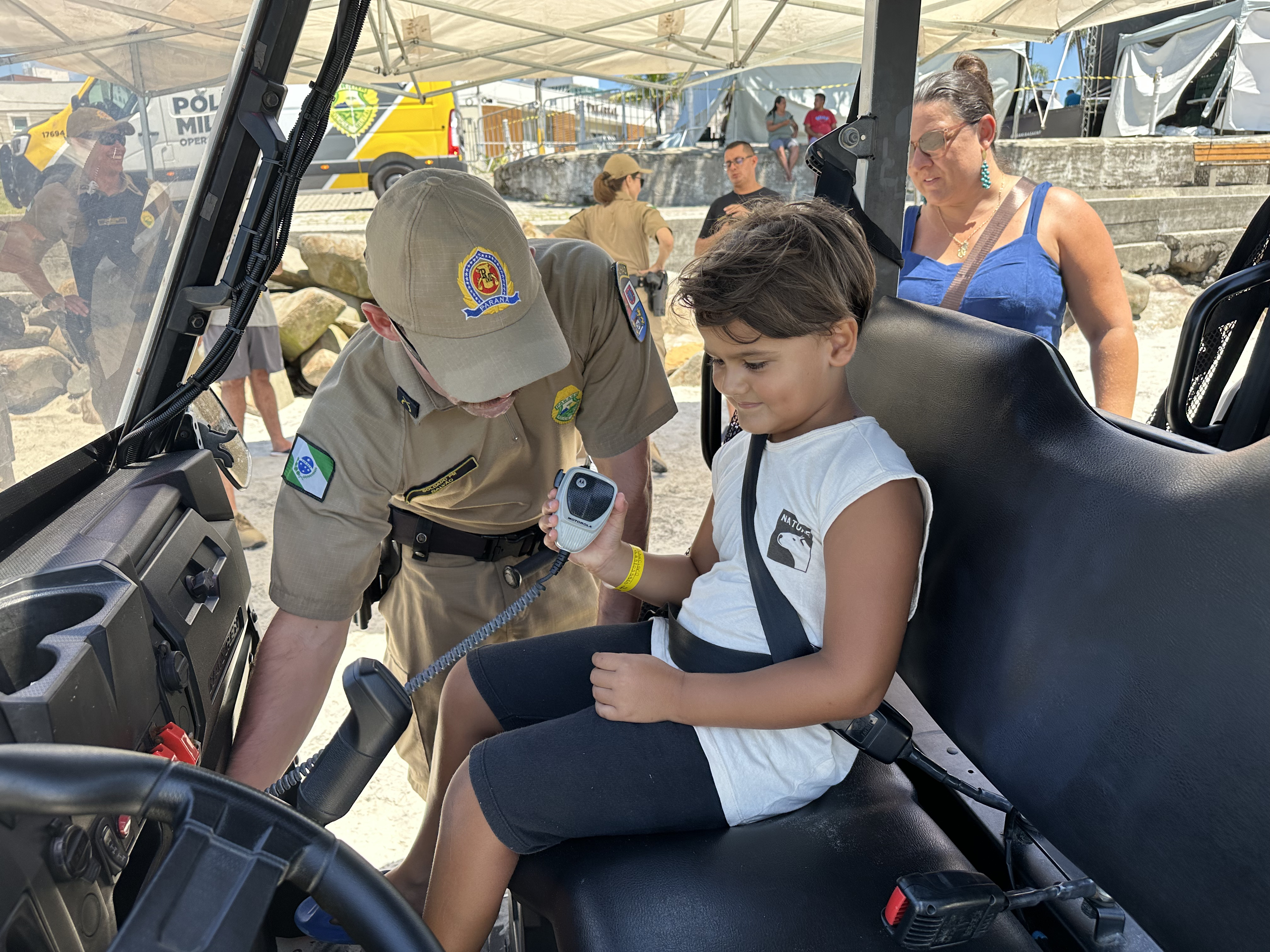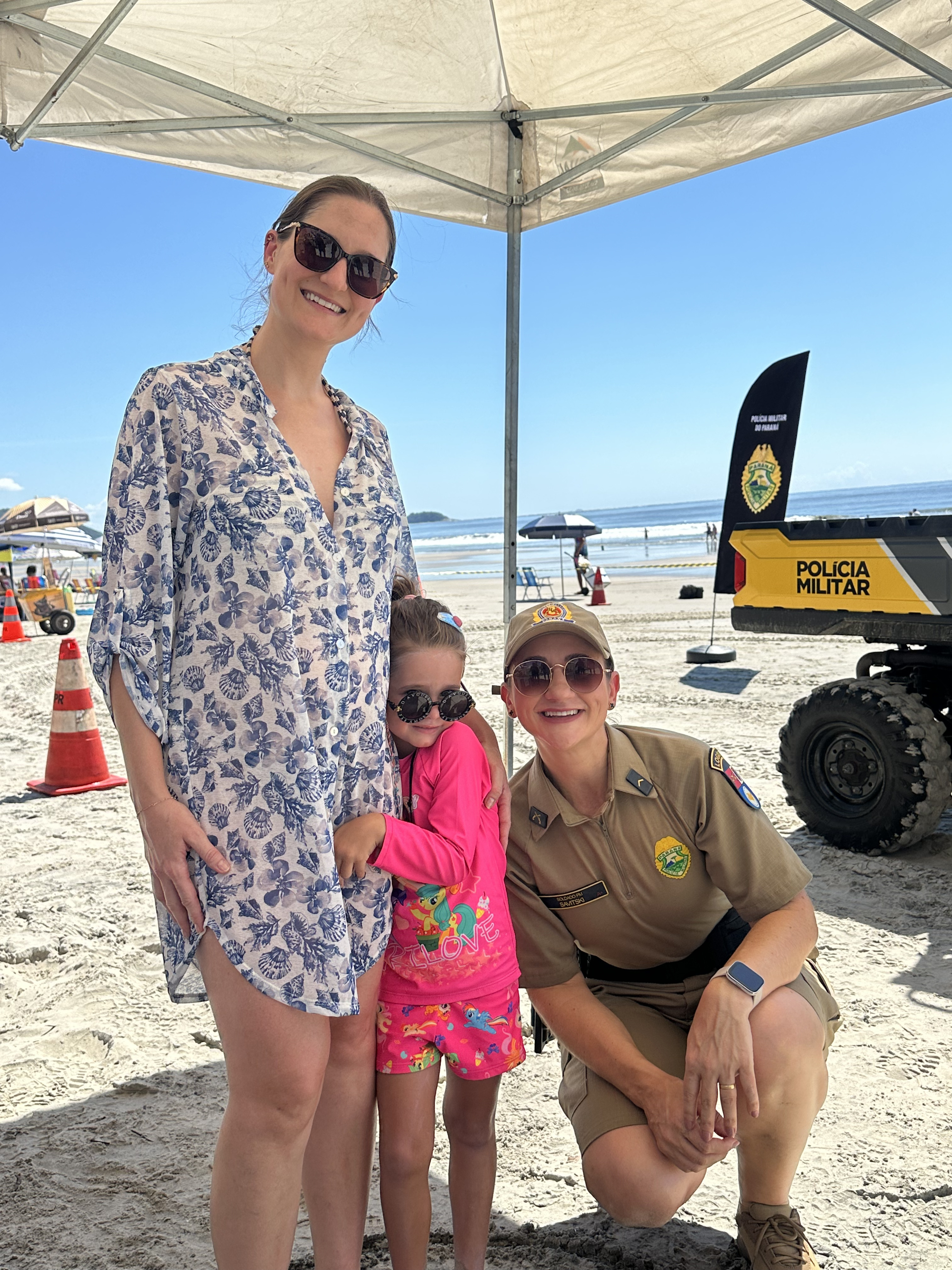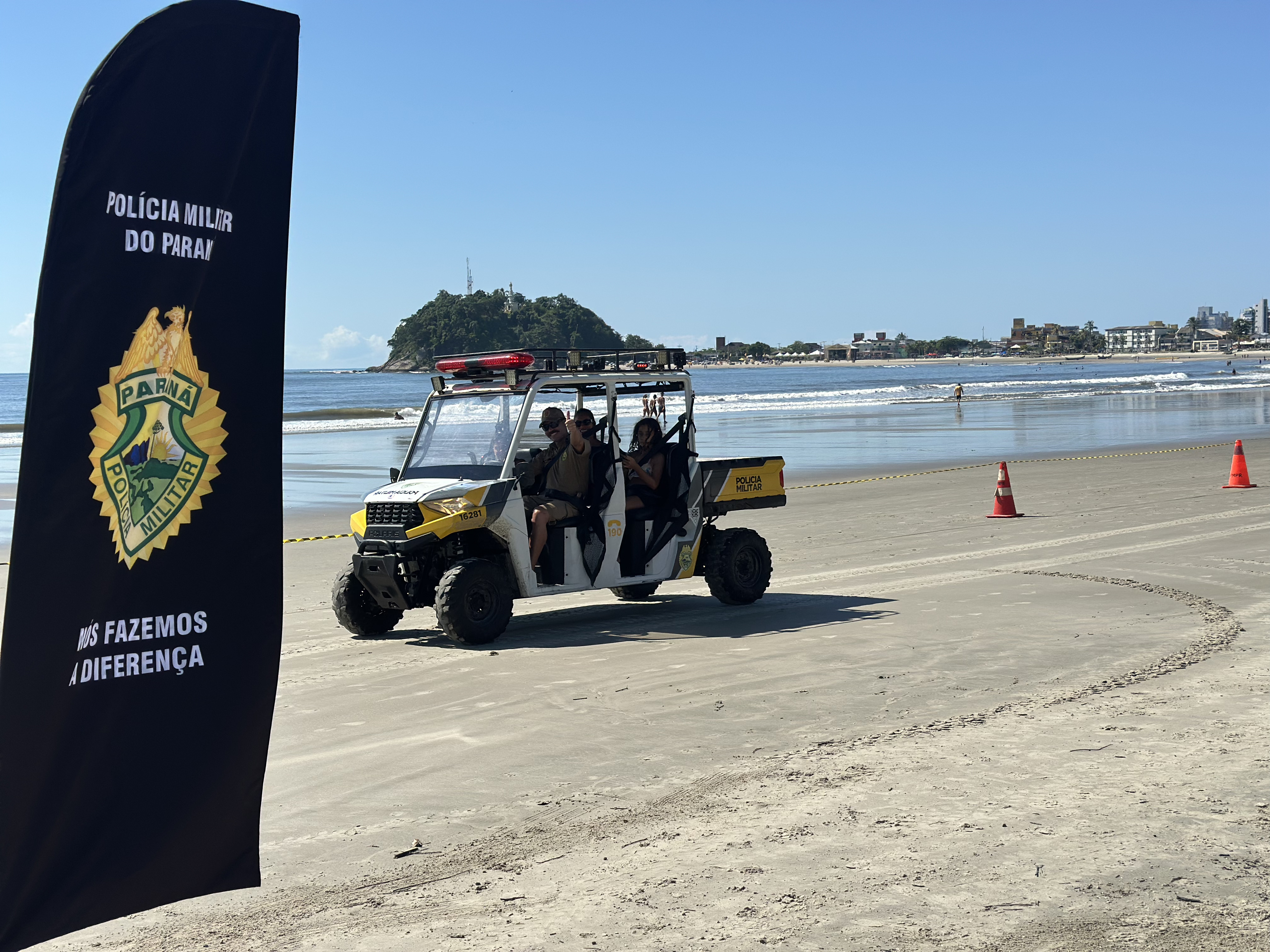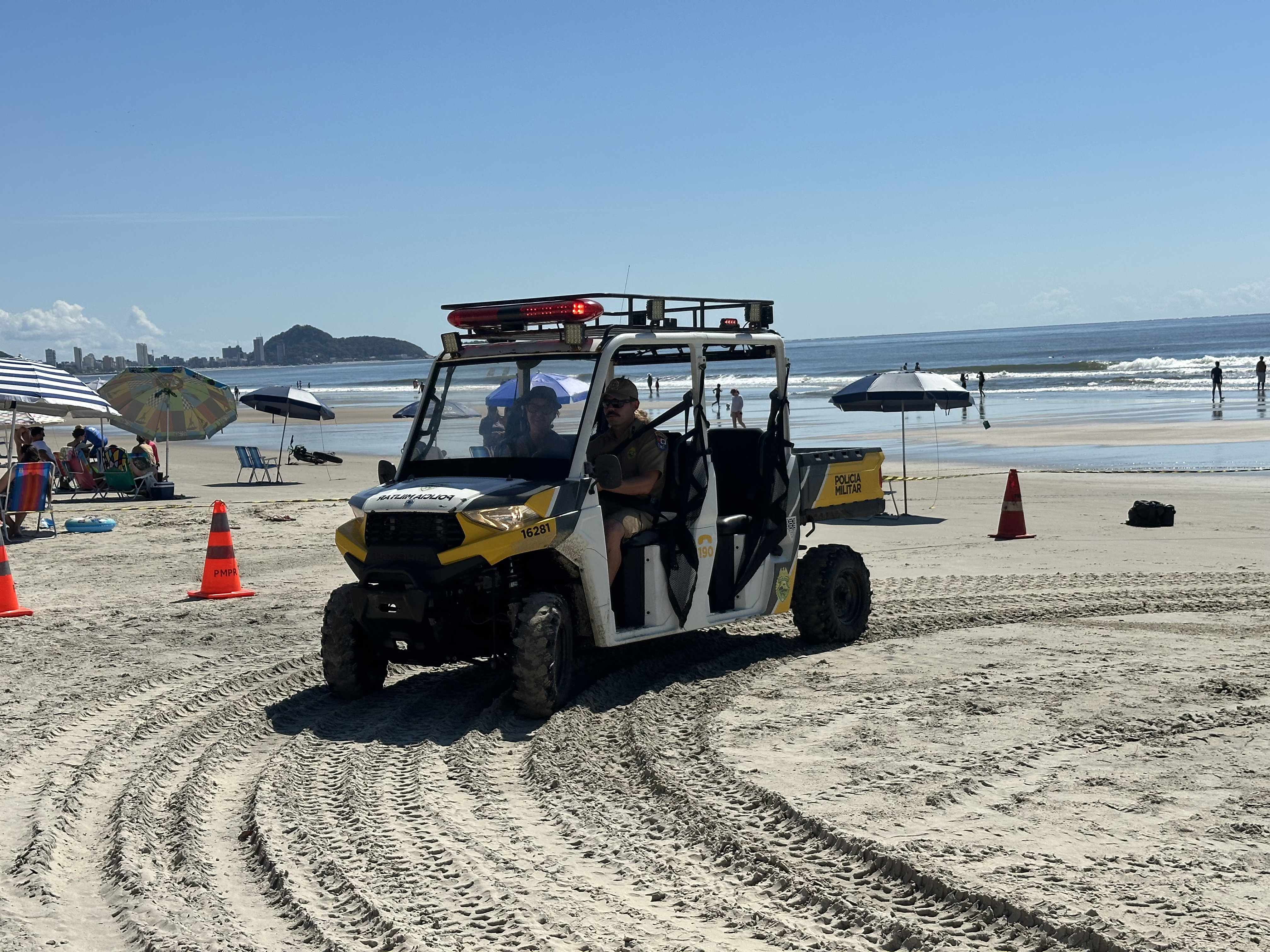 Sorrisos, curiosidade e muita interação marcaram a manhã desta sexta-feira (6) na Praia Central de Guaratuba, durante a ação “Voltinha UTV PMPR”, promovida pela equipe de Interação Comunitária do Centro de Comunicação Social da Polícia Militar do Paraná (PMPR), em conjunto com a equipe de policiamento ostensivo da Operação Verão Maior que atua no município. A iniciativa levou orientação, segurança e diversão a veranistas e moradores, fortalecendo os laços entre a Corporação e a comunidade.