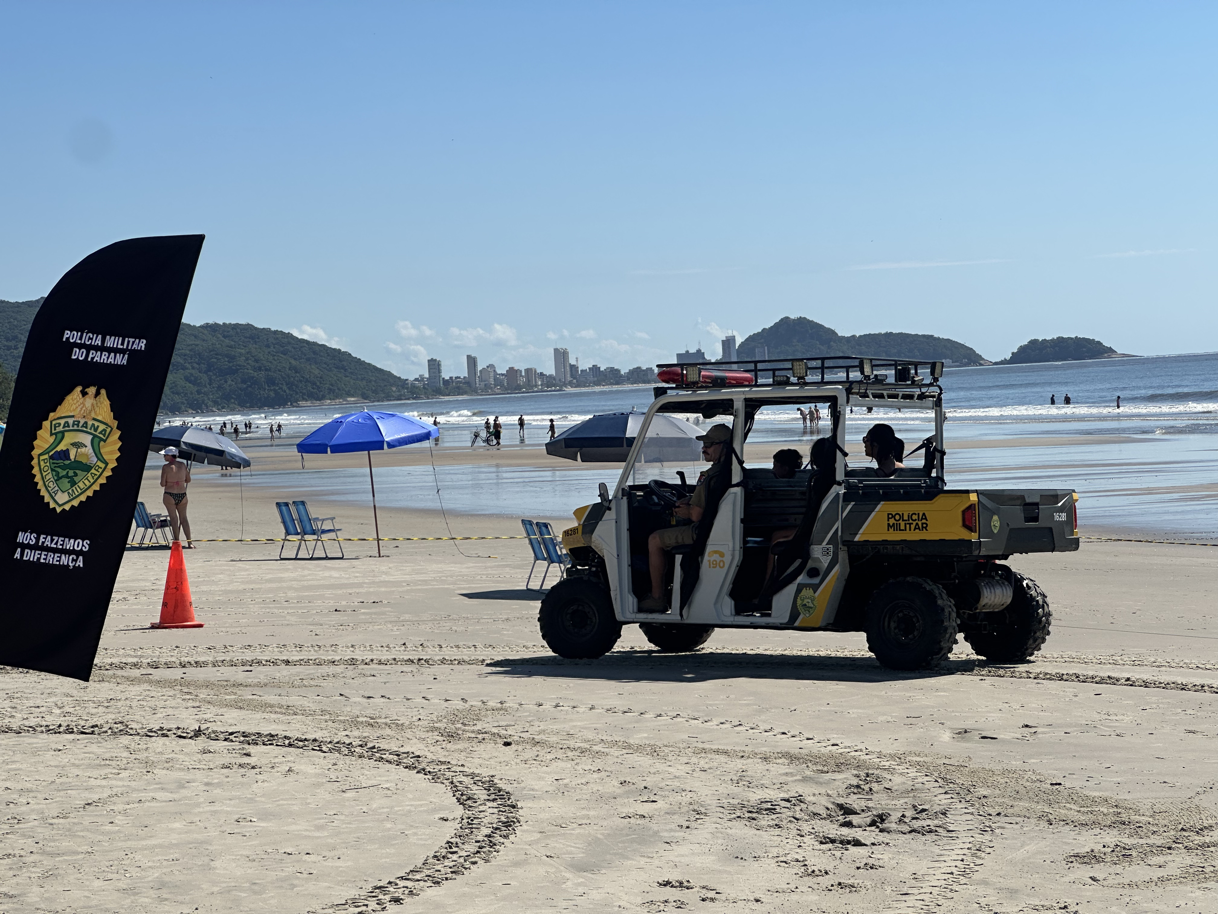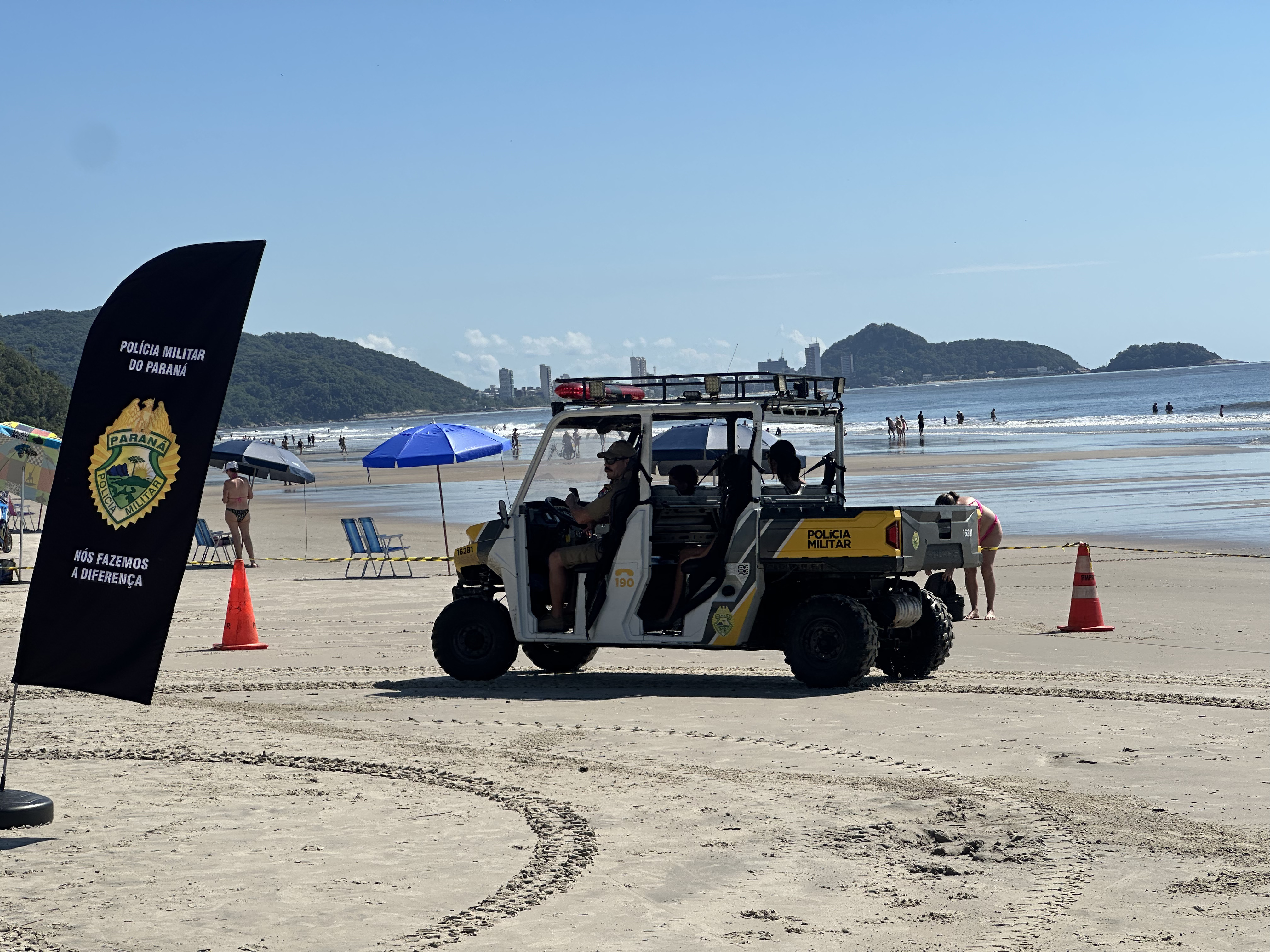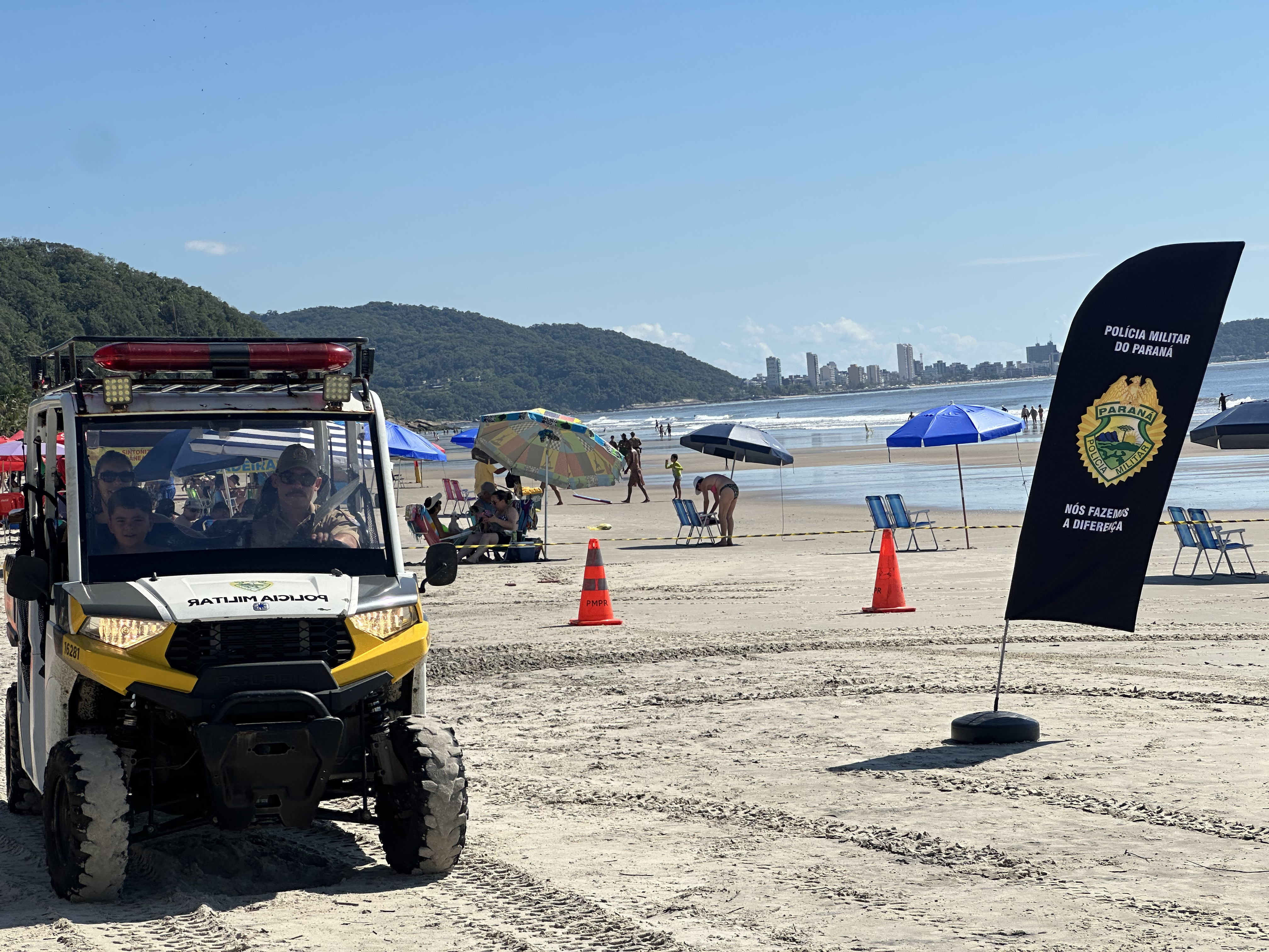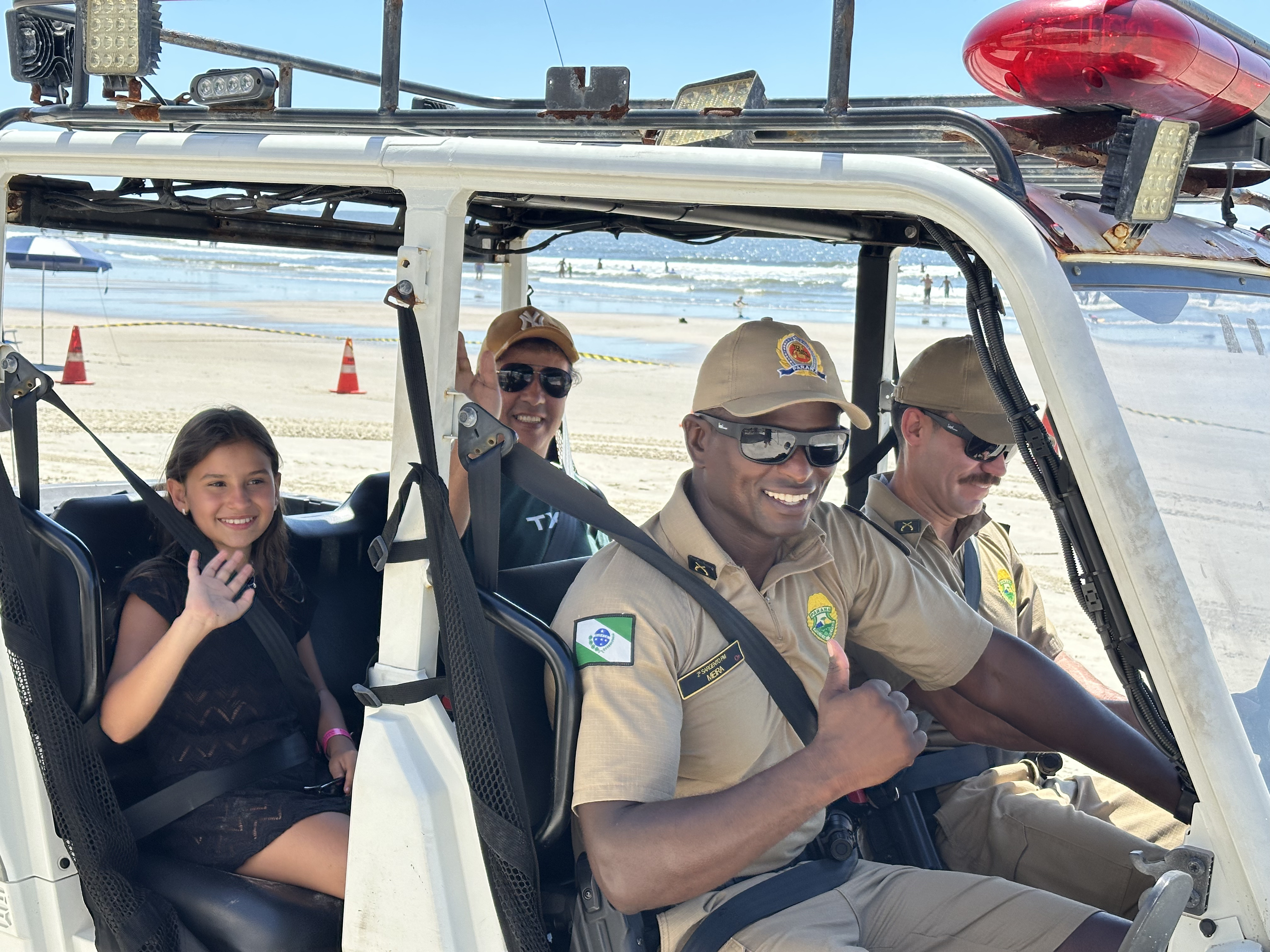 Sorrisos, curiosidade e muita interação marcaram a manhã desta sexta-feira (6) na Praia Central de Guaratuba, durante a ação “Voltinha UTV PMPR”, promovida pela equipe de Interação Comunitária do Centro de Comunicação Social da Polícia Militar do Paraná (PMPR), em conjunto com a equipe de policiamento ostensivo da Operação Verão Maior que atua no município. A iniciativa levou orientação, segurança e diversão a veranistas e moradores, fortalecendo os laços entre a Corporação e a comunidade.