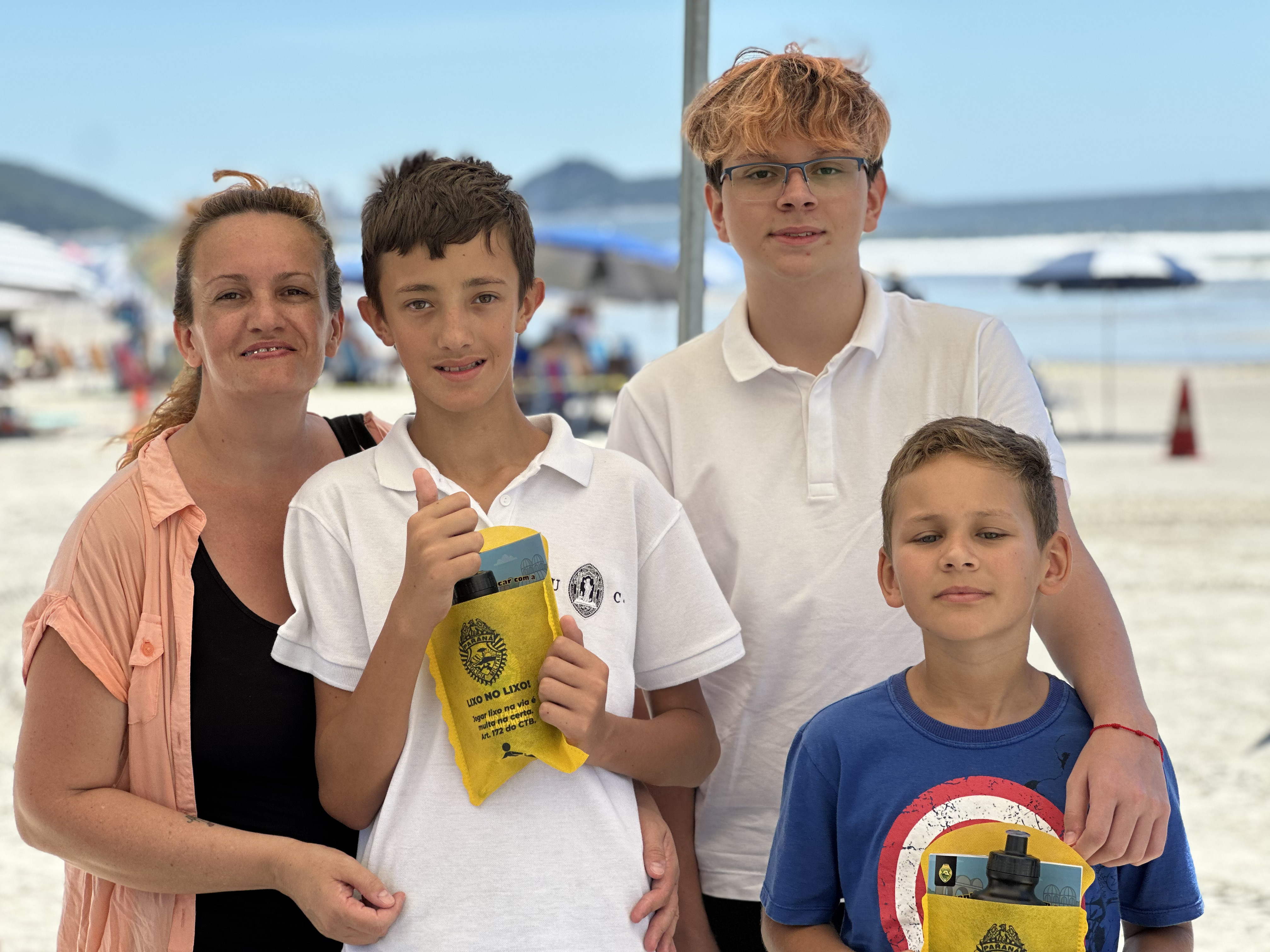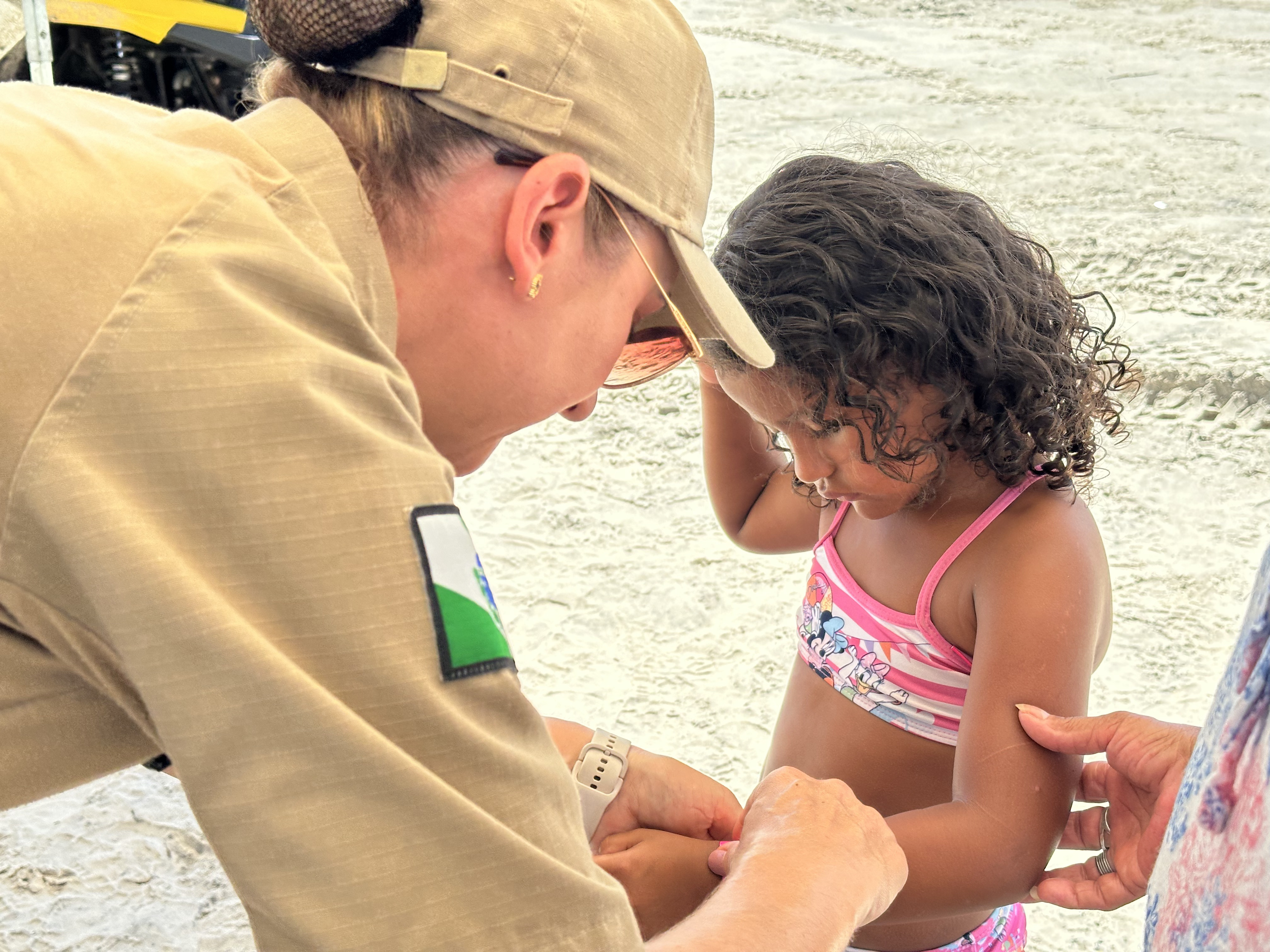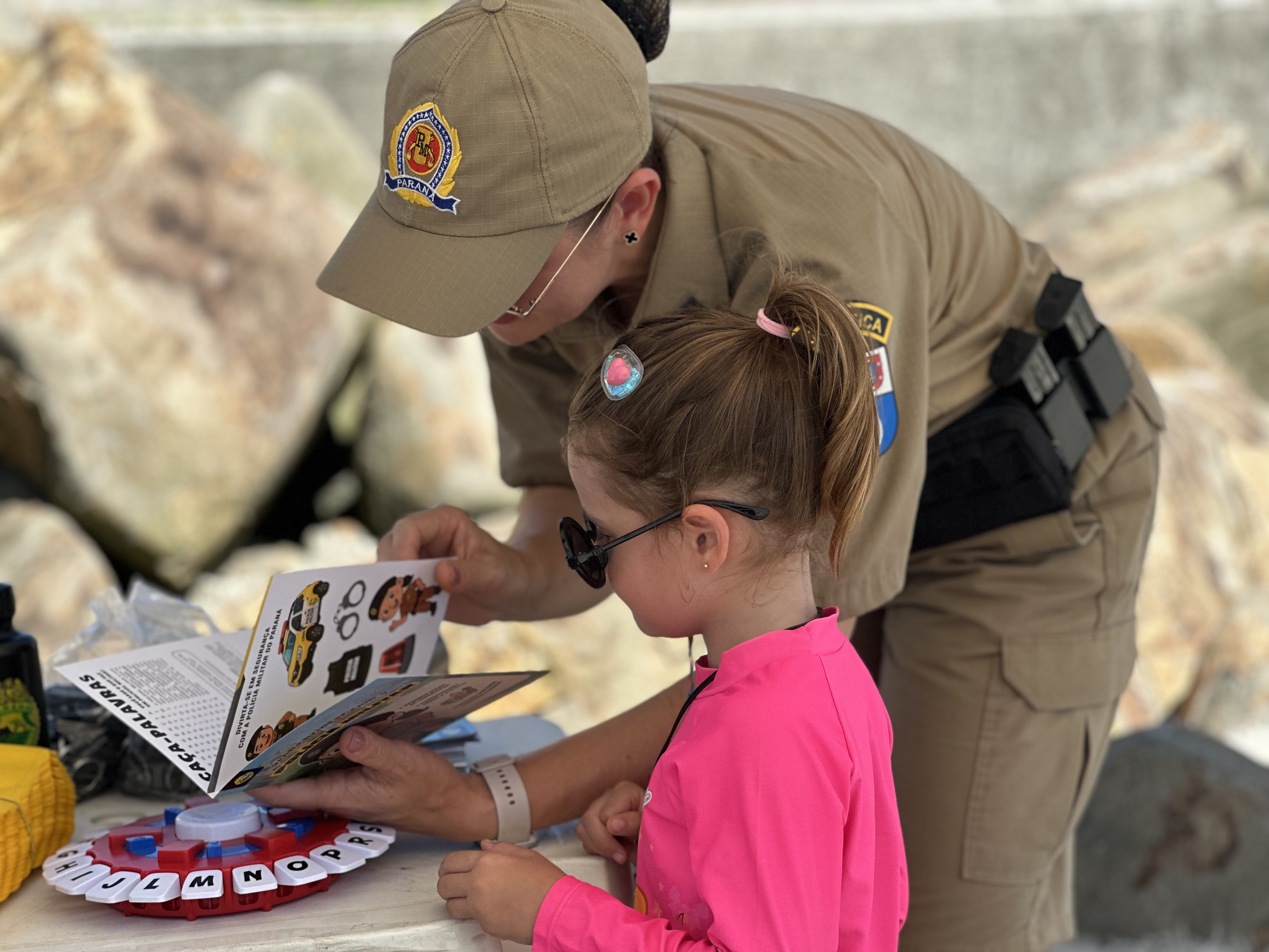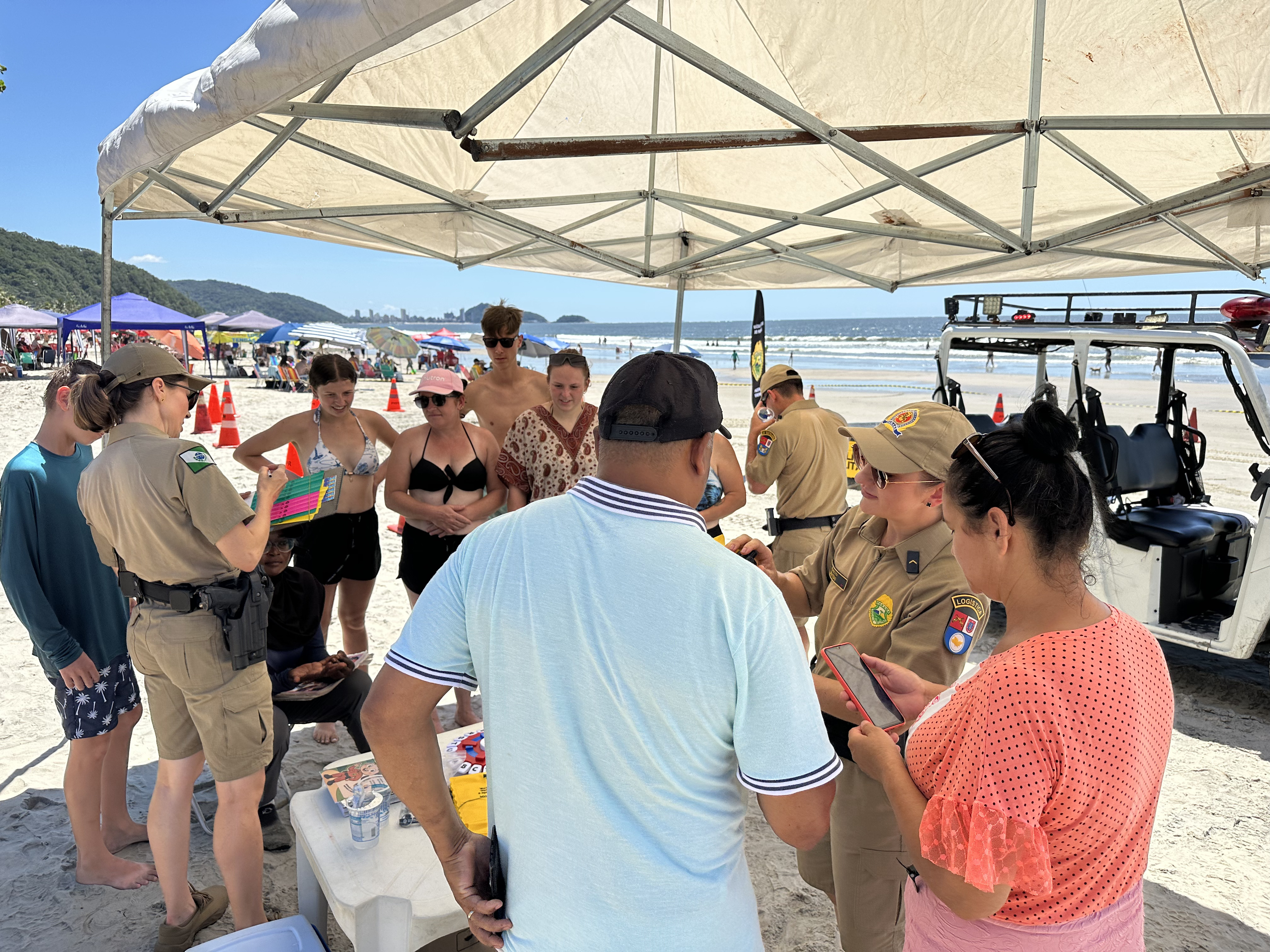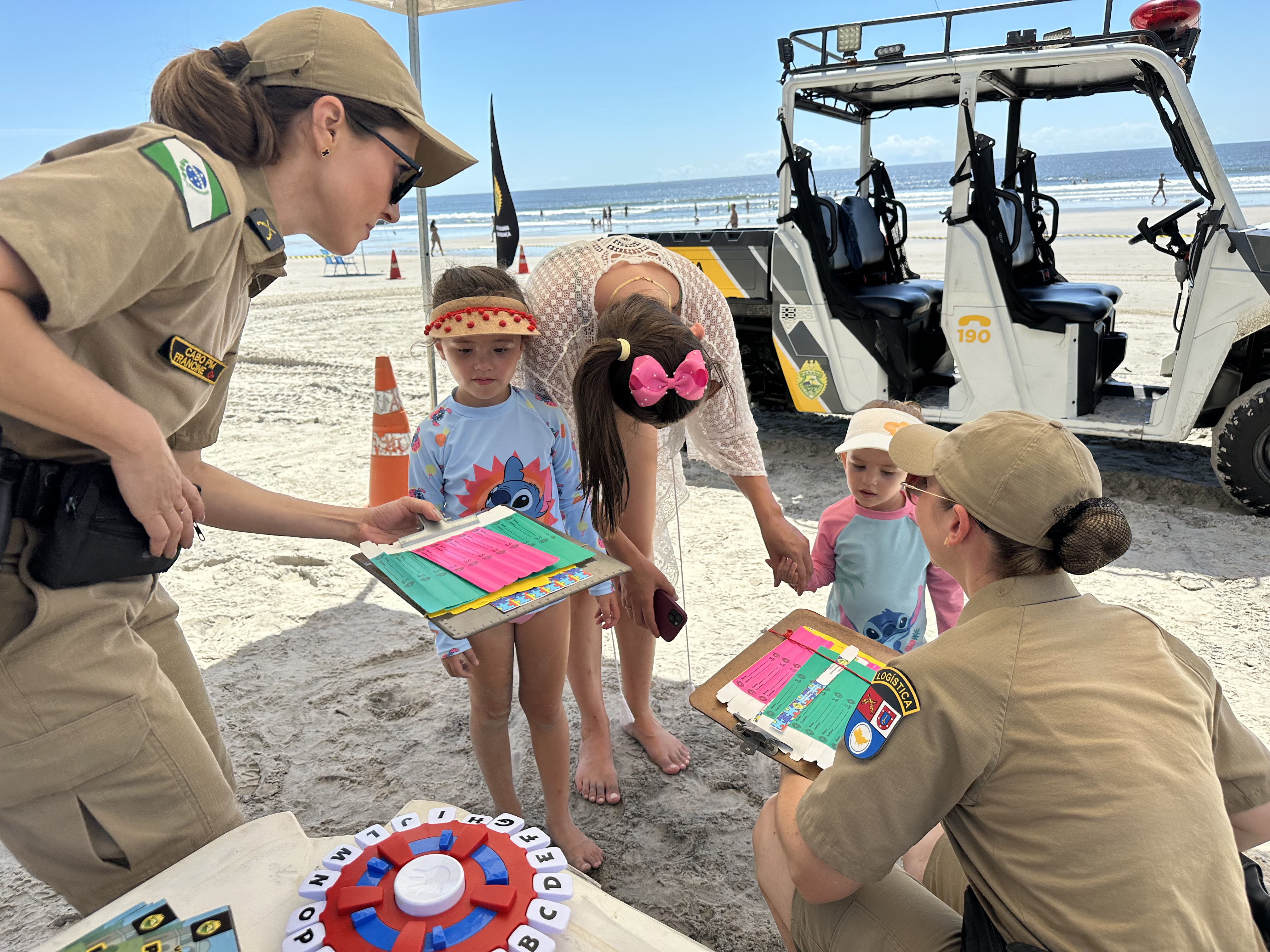 A atividade começou com um gesto simples, mas fundamental: a identificação das crianças com pulseiras, reforçando a segurança e a tranquilidade das famílias. Em seguida, os policiais conversaram de forma leve e acessível sobre cuidados na praia e no trânsito, destacando a importância do uso do cinto de segurança e de atitudes responsáveis no dia a dia.