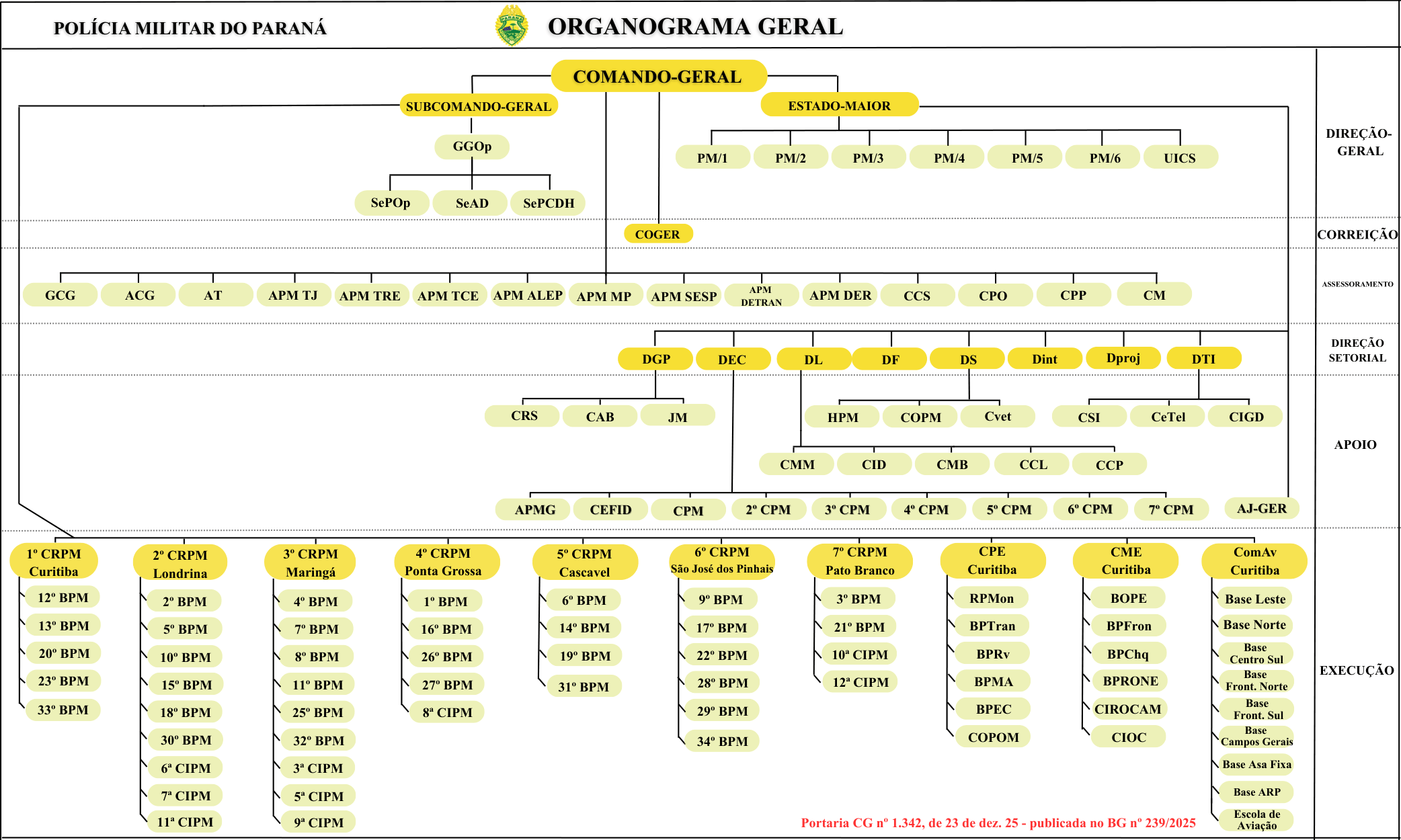 Organograma A estrutura organizacional da Polícia Militar do Paraná está representada no organograma estrutural abaixo: Compartilhe: Voltar Início Imprimir Baixar